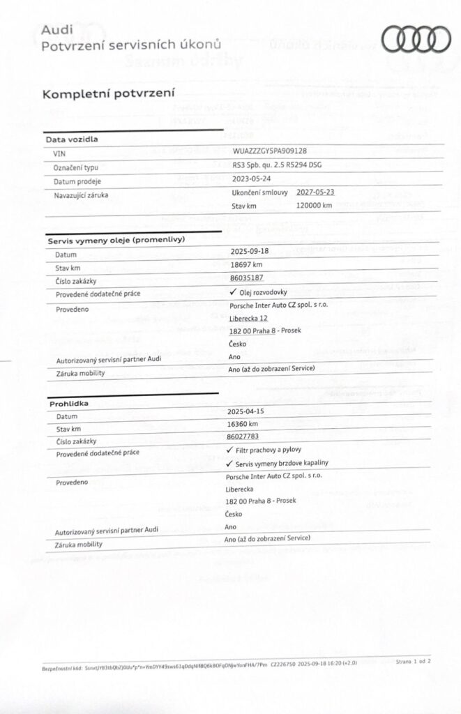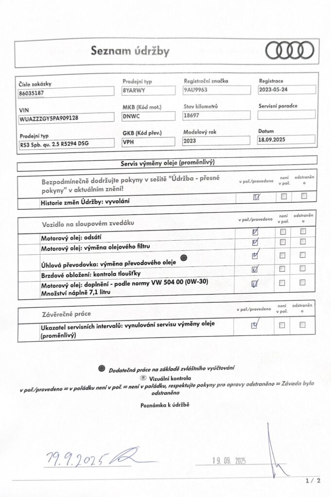 18.09.2025 při 18 697 km (výměna oleje v motoru + filtru, výměna oleje v rozvodovce)